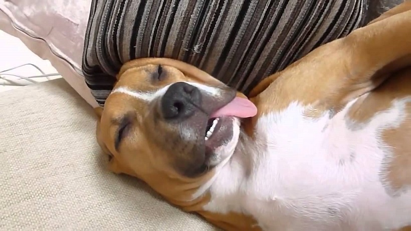 When dogs fall asleep, they enter deep sleep. Their breathing and heart rate slow while their blood pressure drops. About 10 minutes in, they enter REM sleep and dream like humans. You can often identify this stage because their eyes roll under their eyelids, and they may start twitching in their sleep as they dream of chasing after squirrels.